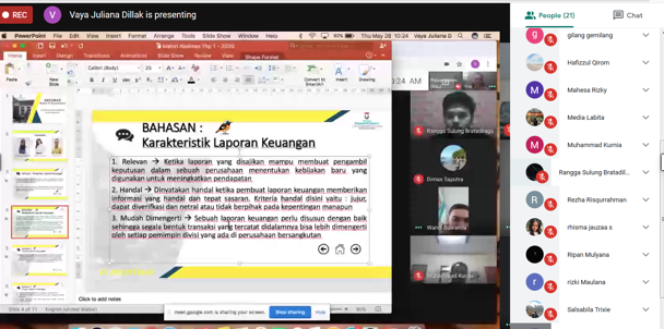 Pada hari Kamis tanggal 28 Mei 2020, Prodi Akuntansi Fakultas Ekonomi dan Bisnis Universitas Telkom memberikan pelatihan kepada pengurus dan anggota Karang Taruna Desa Jatiendah tentang pencatatan dan pelaporan secara akuntansi. Karang Taruna RW 02 berlokasi di jl. Cikoang Kidul Rw 02 Desa Jatiendah. Pelaksanaan abdimas dilakukan secara daring menggunakan aplikasi googlemeet di tengah pandemik yang melanda Indonesia saat ini. Antusiasme peserta tergambarkan melalui berbagai pertanyaan dan sharing pengalaman mendokumentasikan bukti-bukti transaksi, pencatatan transaksi, mencari selisih dan membuat laporan keuangan. Untuk mendukung salah satu tujuan karang taruna yaitu membangun karakter generasi muda yang berpengetahuan, berkepribadian, terampil, cerdas, inovatif dan berkarya.